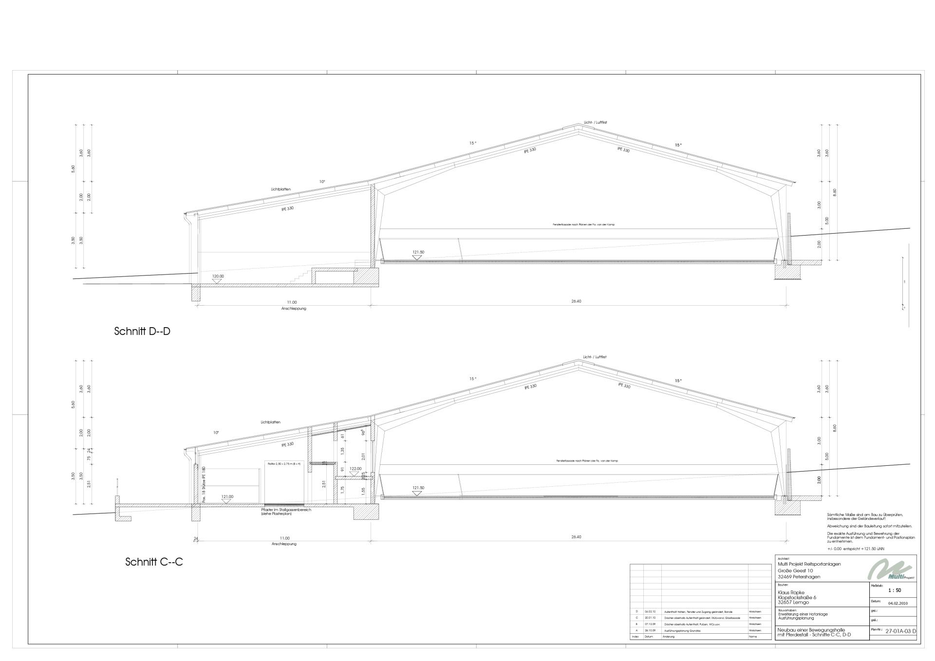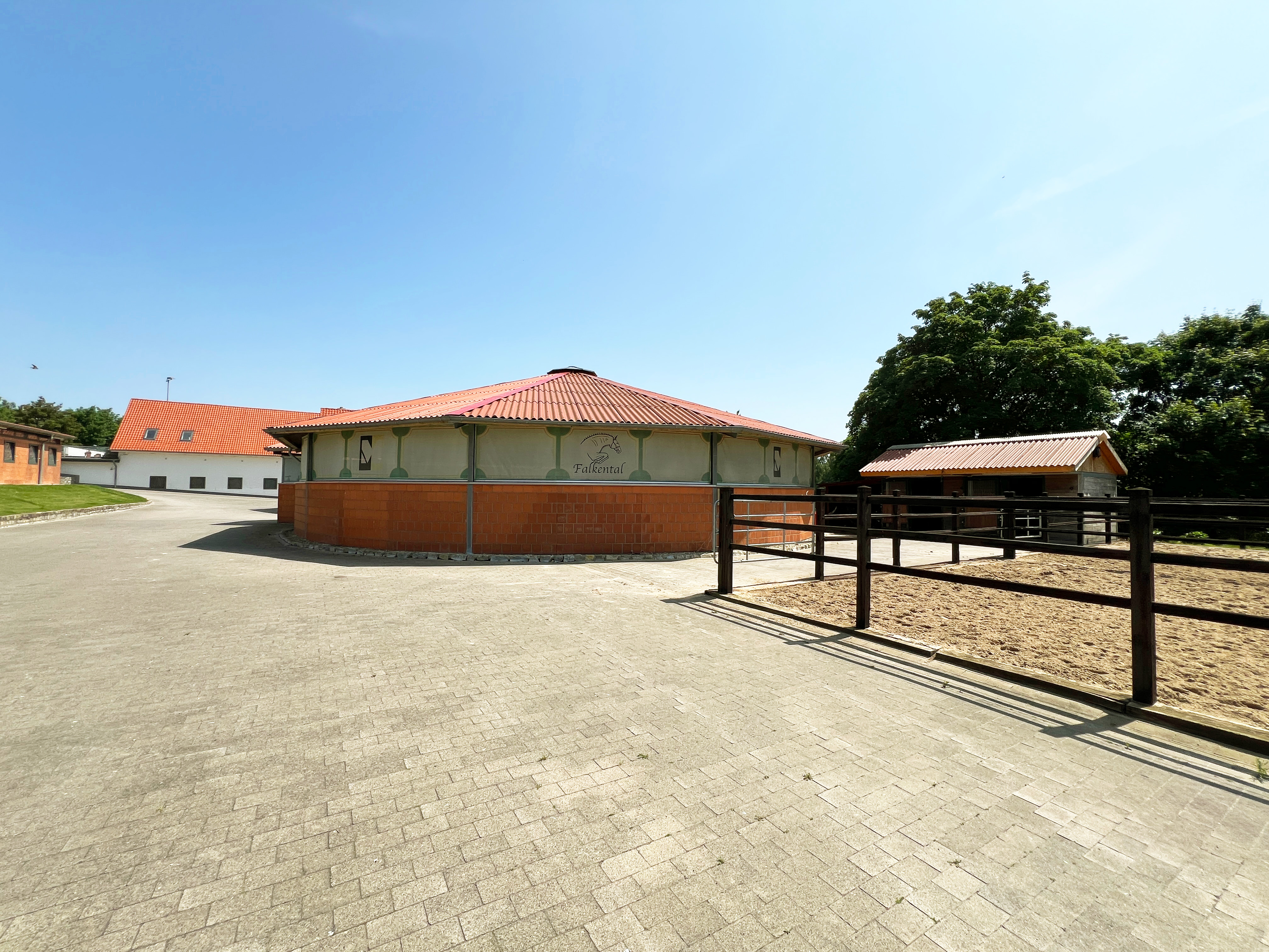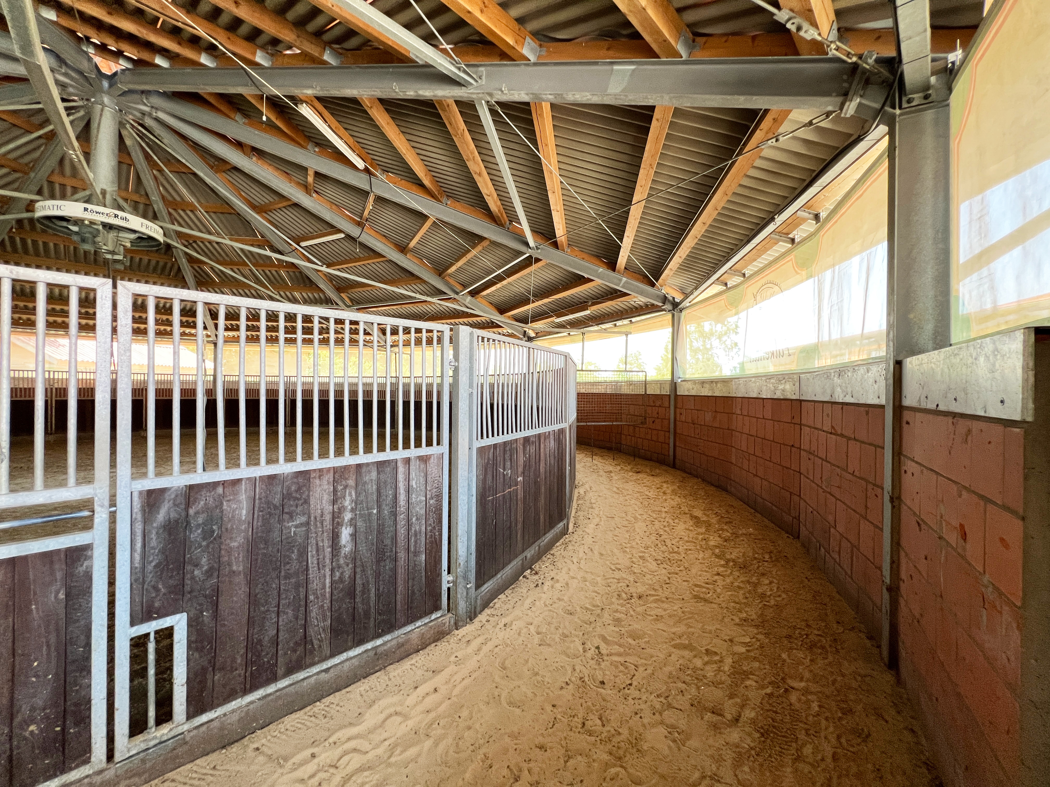 – Röwer & Rüb Longierhalle mit Führanlage (aus 2010; 20 m Durchmesser, 6 Führplätze, gefederter Pflasterboden, automatische Beregnung, ganzjährig nutzbar, eingefasst mit ca. 2 m hohen gemauerten Wänden, darüber offen für ideale Belüftungs- und Lichtverhältnisse)