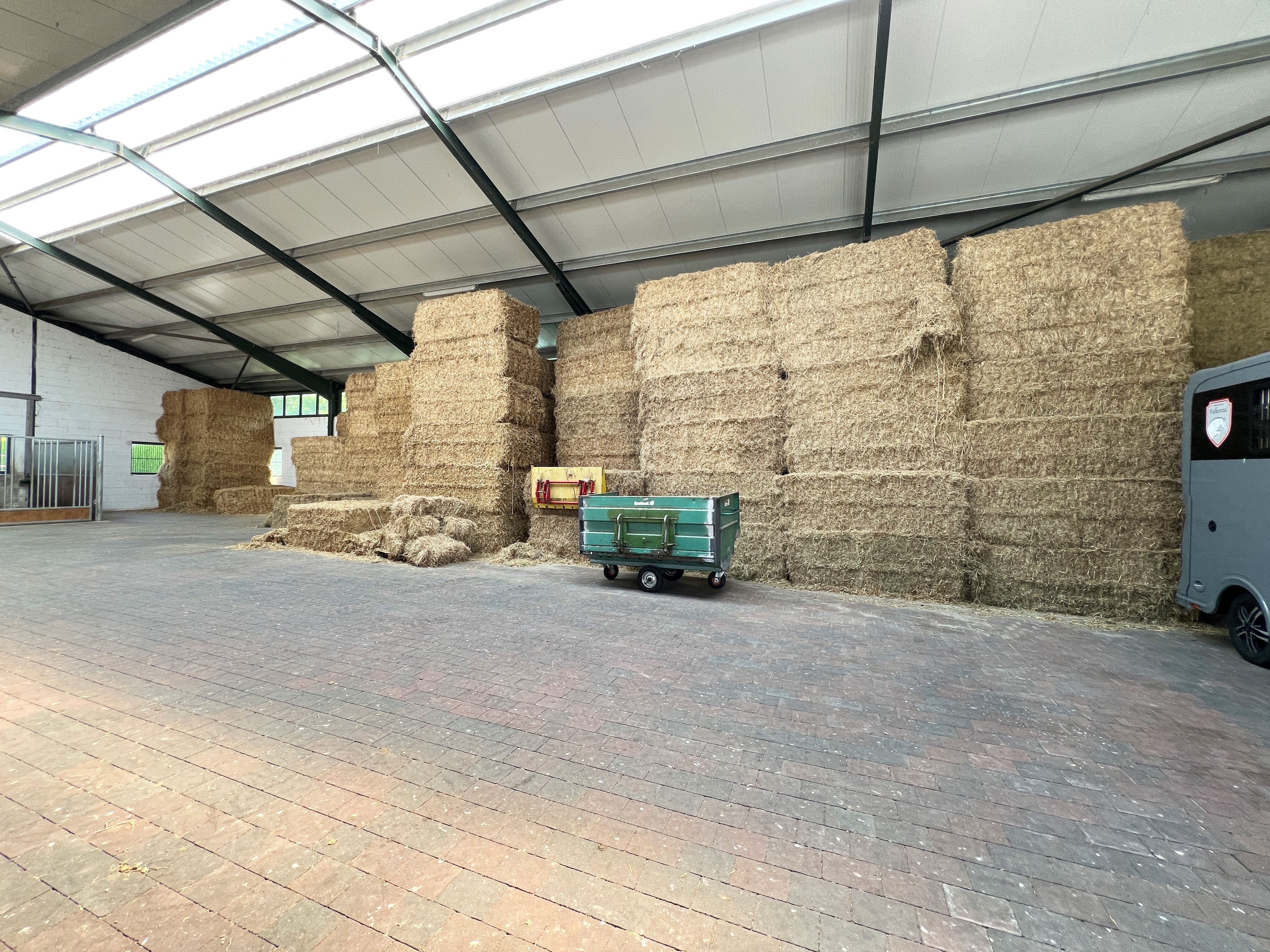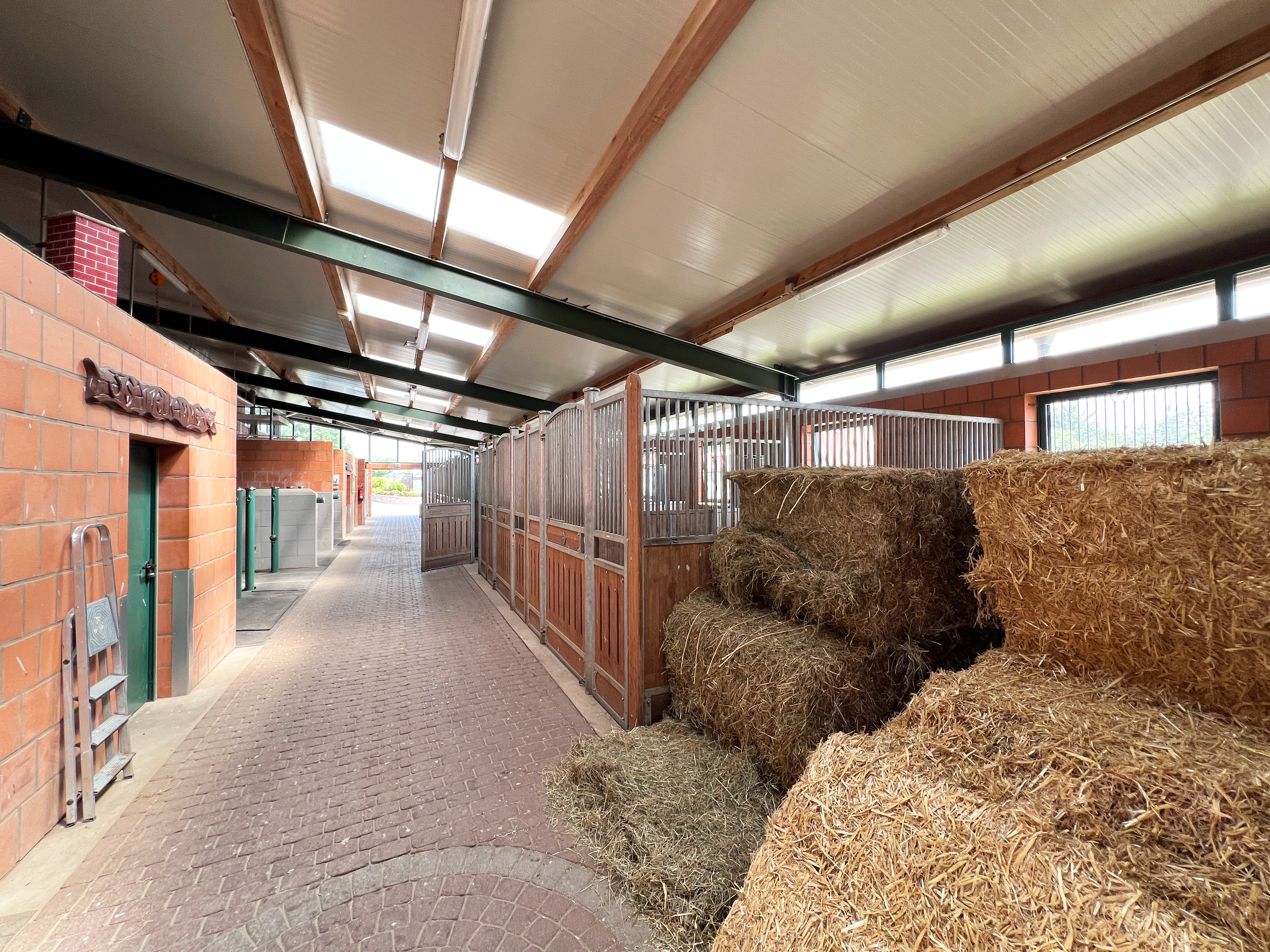 – Isolierte, gepflasterte Lagerhalle und / oder Zuchtstall (Neubau in 2014; 5 Großboxen für tragende Stuten/Hengste; Untersuchungsstand für Tierarzt; Lagerung von Raufutter und Maschinenfuhrpark, nutzbar als Halle oder Stalltrakt)