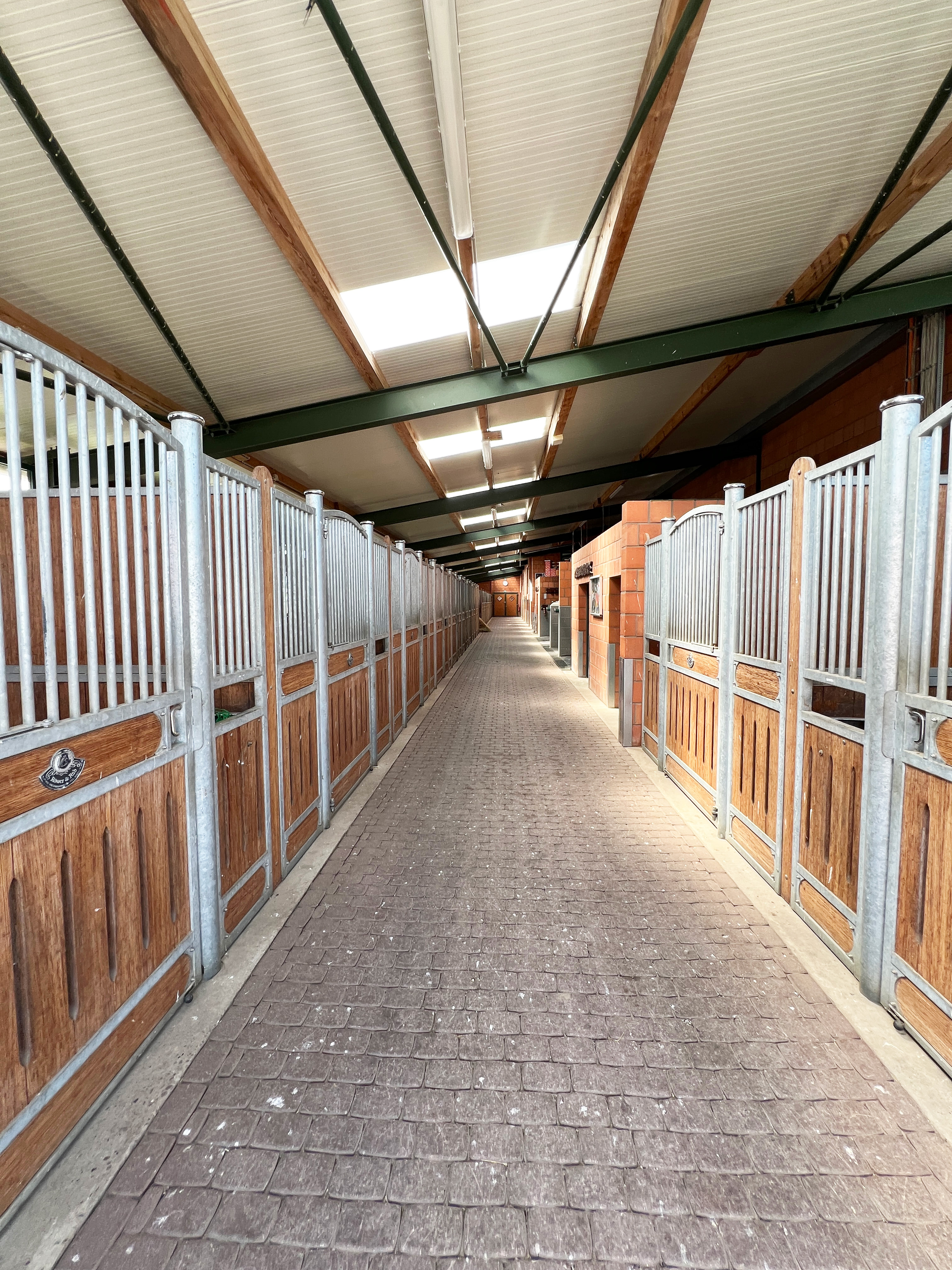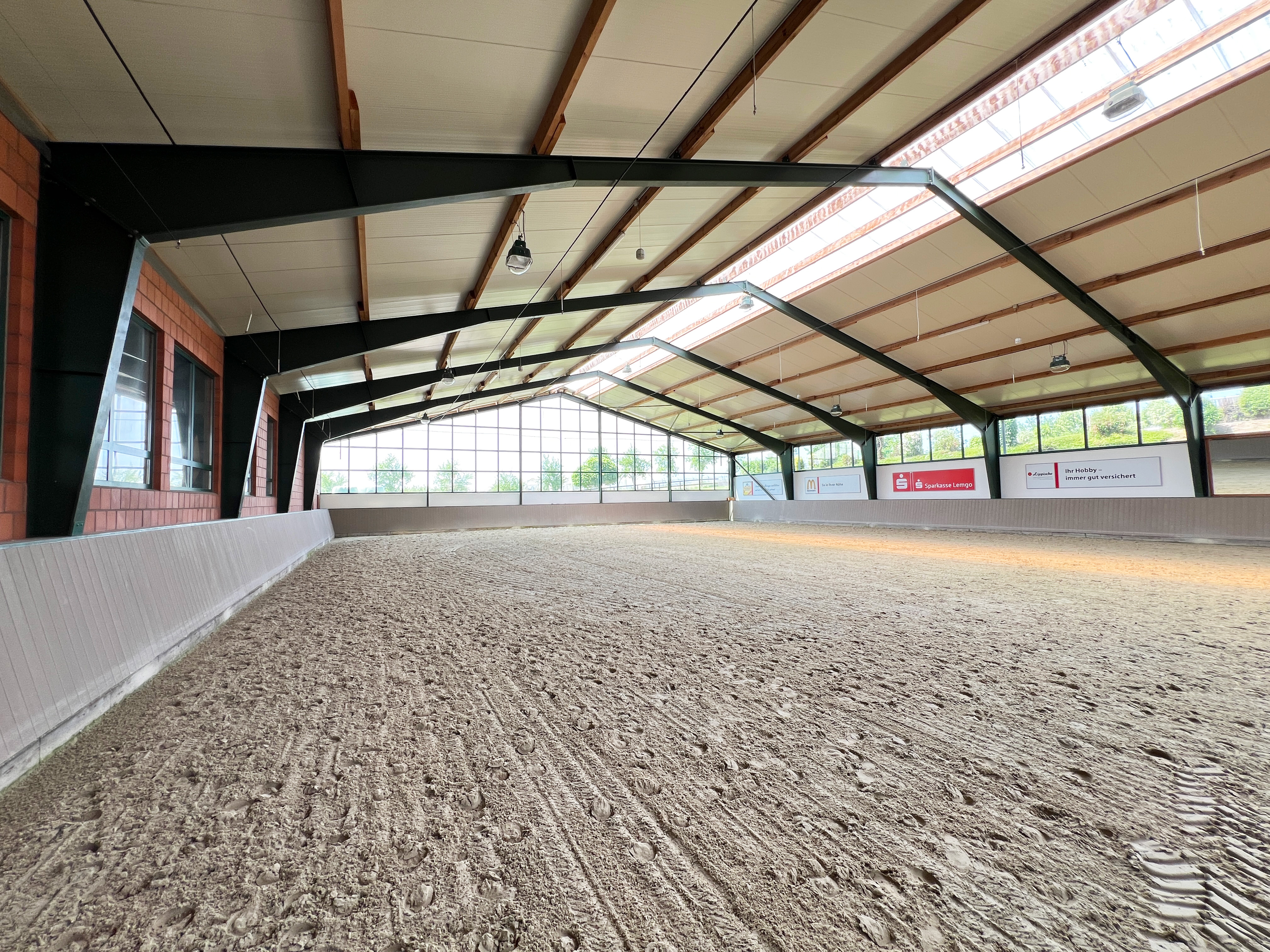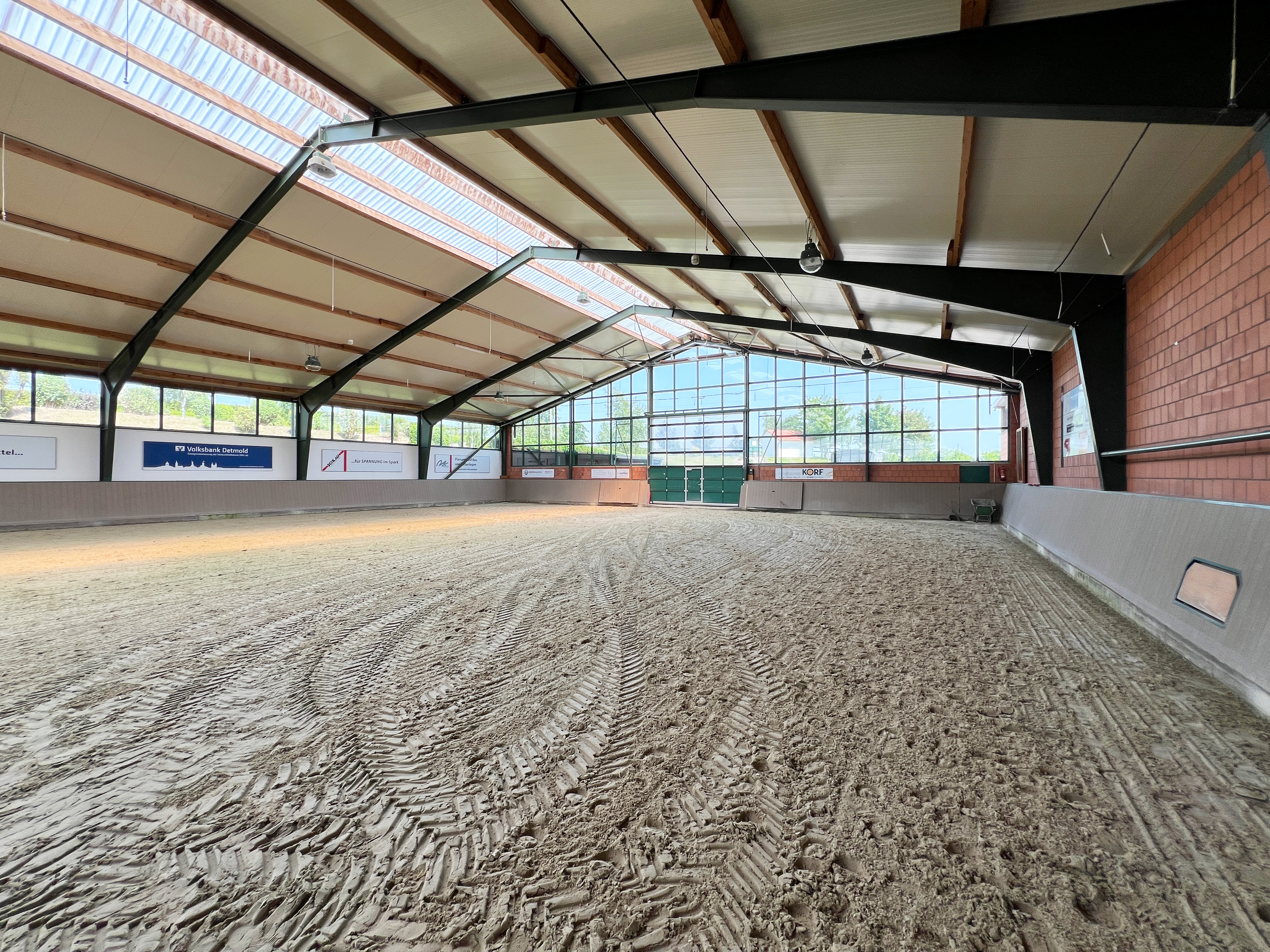 – Professionelle Reithalle mit Stremmer Sand (Neubau in 2010; Überlänge (55 m x 25 m), dadurch geeignet für ideale Wettbewerbsbedingungen) mit angeschlossenen Röwer & Rüb Pferdeboxen für rund 20 Pferde inklusive 4 Putz-/Waschplätze, automatischer Beregnungsanlage, 2 Sattelkammern, (Gäste-)WCs, 2 Solarien, Lautsprecher- und Headsetmöglichkeit, Büro sowie beheizbarer ca. 70 m² großer Aufenthalts-, Bar und Tribünenbereich)