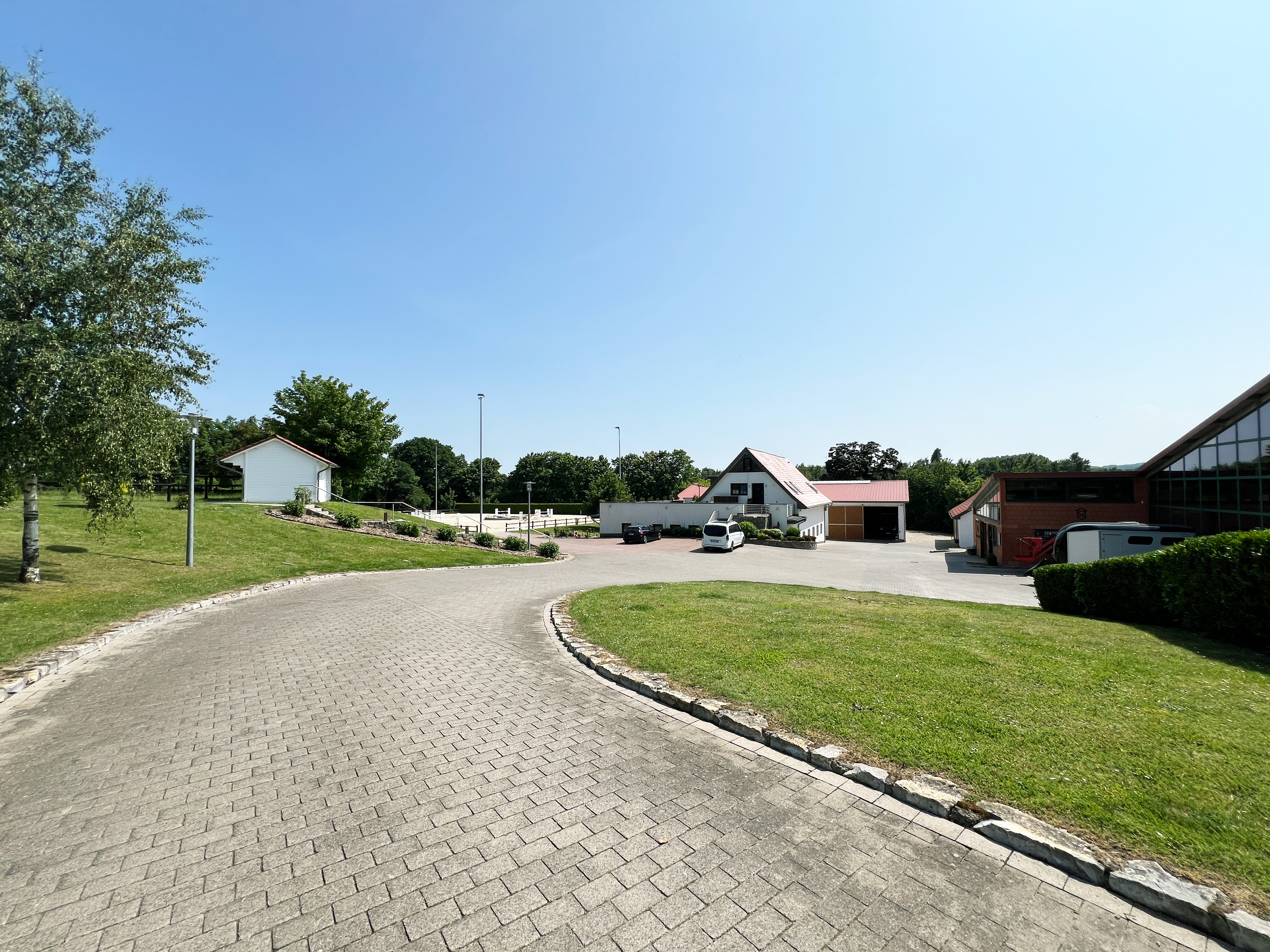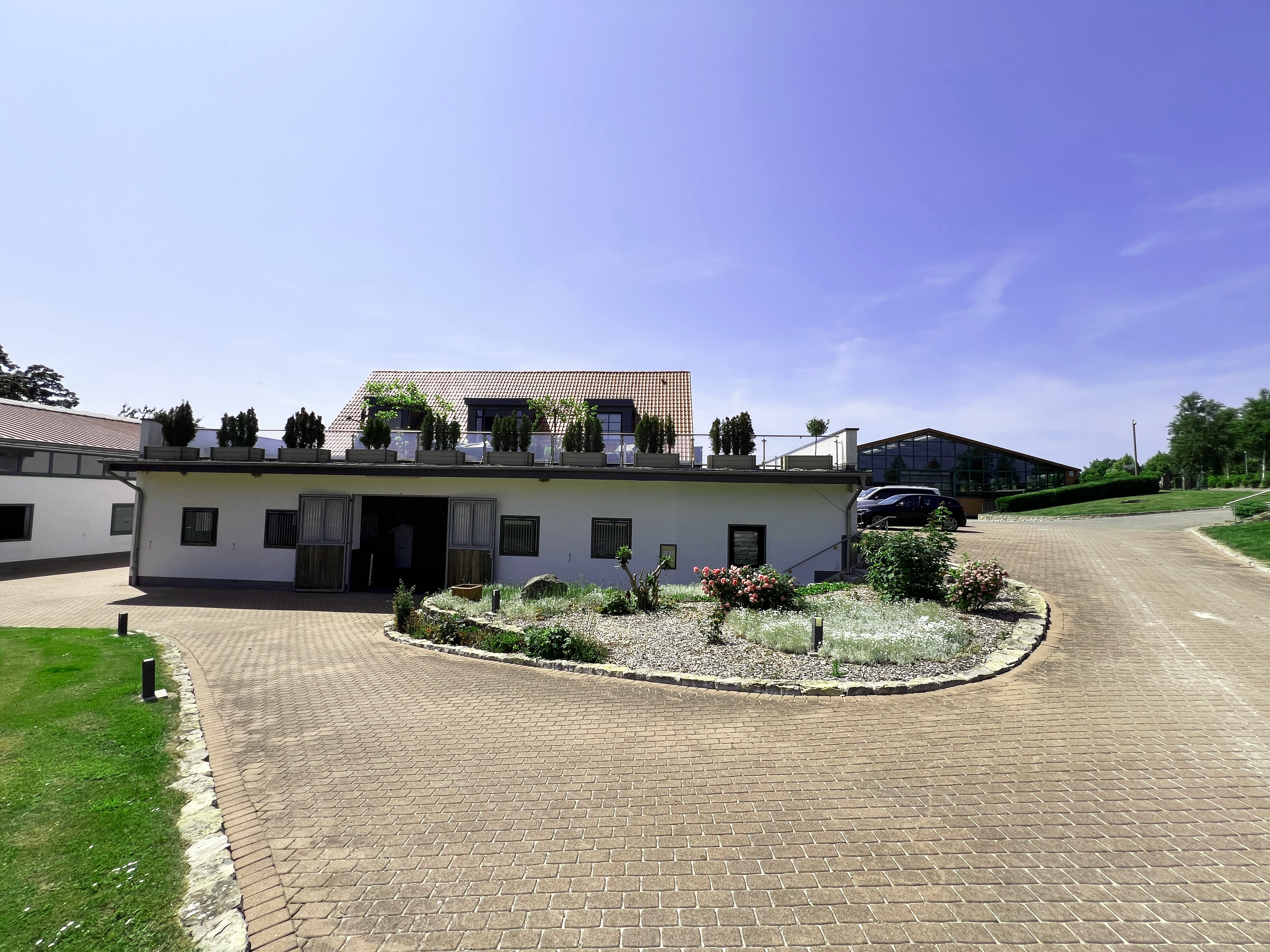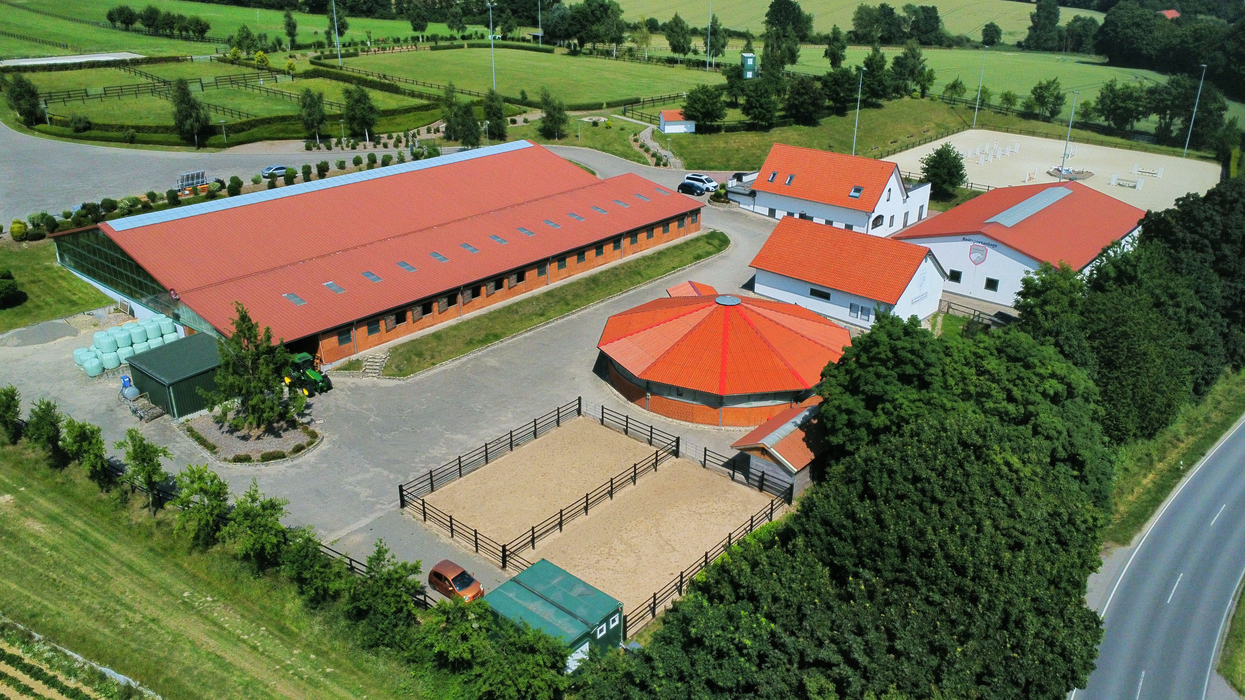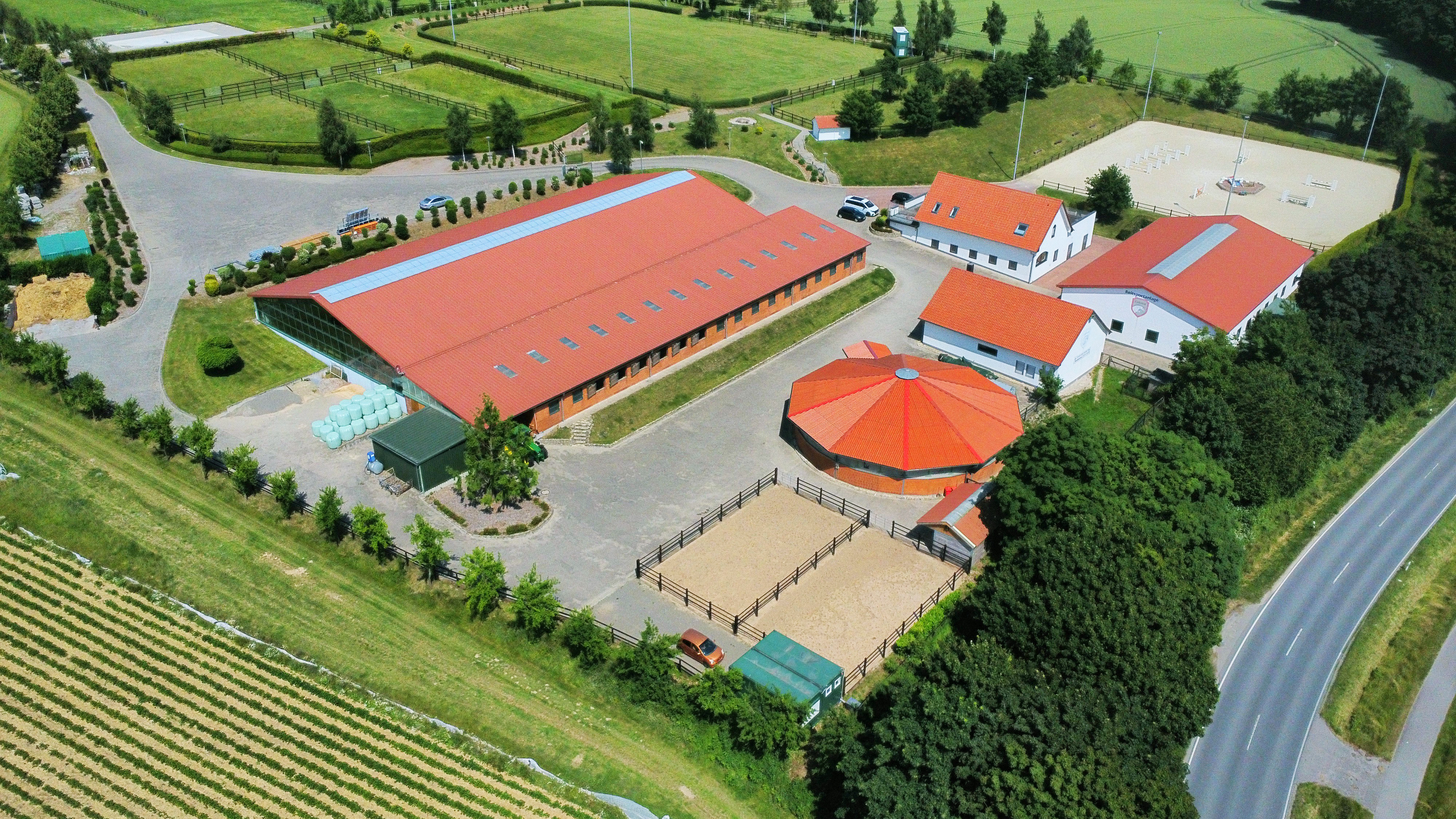 – Professionelle Reithalle aus dem Jahr 2010 in Überlänge (55 m x 25 m, geeignet für Wettbewerbsbedingungen) mit angeschlossenen Pferdeboxen für rund 20 Pferde inklusive 4 Putz-/Waschplätze (inkl. Pferdestaubsauger), spezielle Energiesparlampen, automatischer Beregnungsanlage, diverse Sattelkammern, 2 Solarien, 2 Sattelkammern, Lautsprecher- und Headsetmöglichkeit sowie Aufenthalts-, Bar und Tribünenbereich