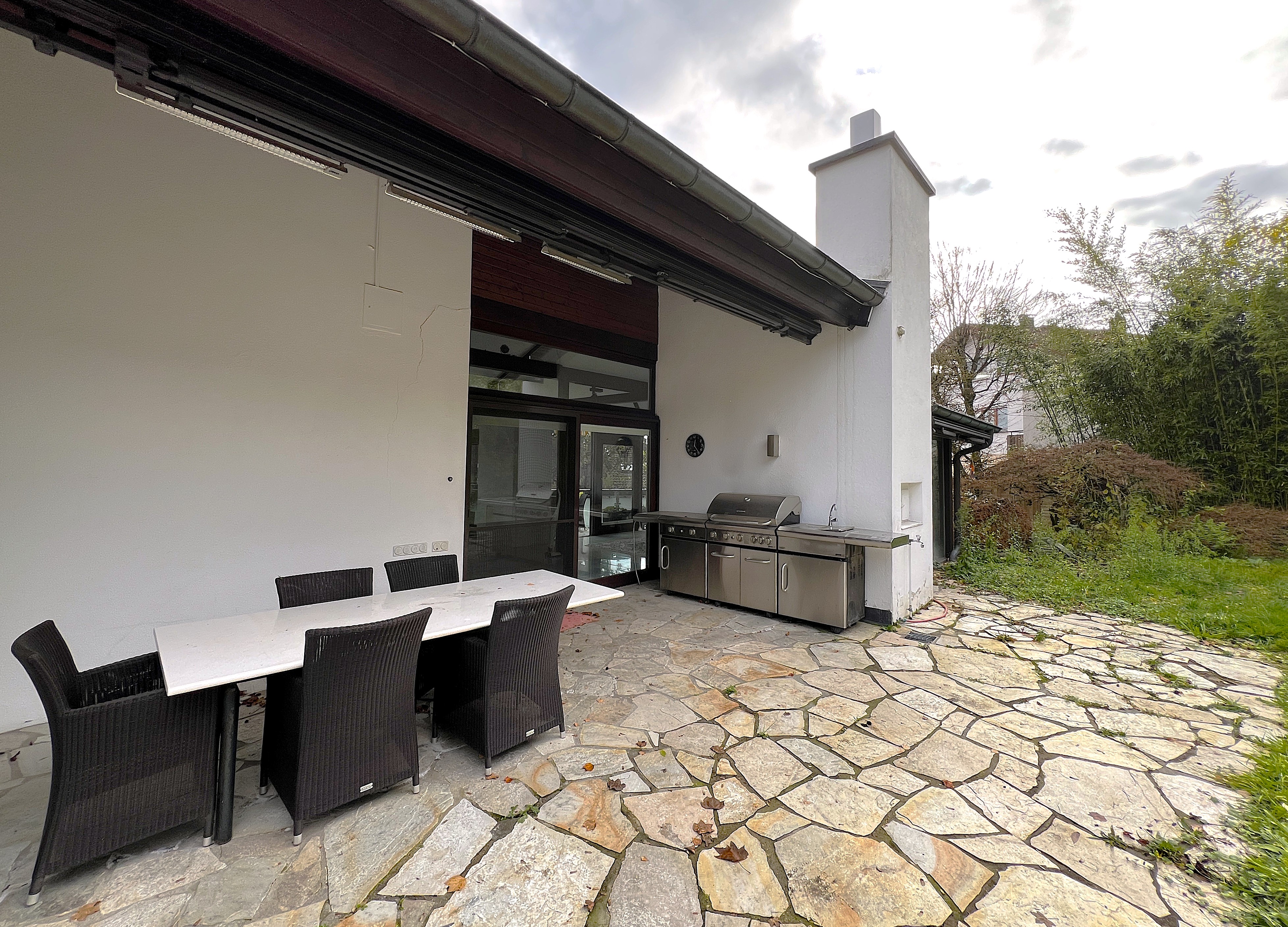 Ihre neue Villa mit Pool erstreckt sich aufgrund der hanggelegenen Grundstückstopologie in Split-Level-Bauweise auf einem 1.943 m² großzügigen Grundstück – einer luxuriösen Grundstücksgröße (Bodenrichtwert von 540 m²), die Ihnen viel Platz zu den angrenzenden Nachbarn und vor allem unbezahlbare Privatshäre und Ruhe garantiert. Gelegen an einer an verkehrsberuhigten Anliegerstraße ohne störenden Durchgangsverkehr überzeugt Ihr neues Architektenhaus mit einer ganzheitlichen Wohn- und Bürofläche von insgesamt ca. 301 m² (zzgl. Wintergarten), die sich über 2 seperate Gebäude (Haupt- und Nebengebäude) verteilen, die wiederum mit einem lichtdurchfluteten Wintergarten räumlich miteinander verbunden sind. Mit insgesamt 9 Zimmern, 3 Badezimmer und 2-3 Küchen ermöglicht die alarmgesicherte Immobilie somit das komfortable Miteinander von bis zu 3 Generationen bzw. die idealtypische Verbindung zwischen Wohnen und Arbeiten unter einem Dach.