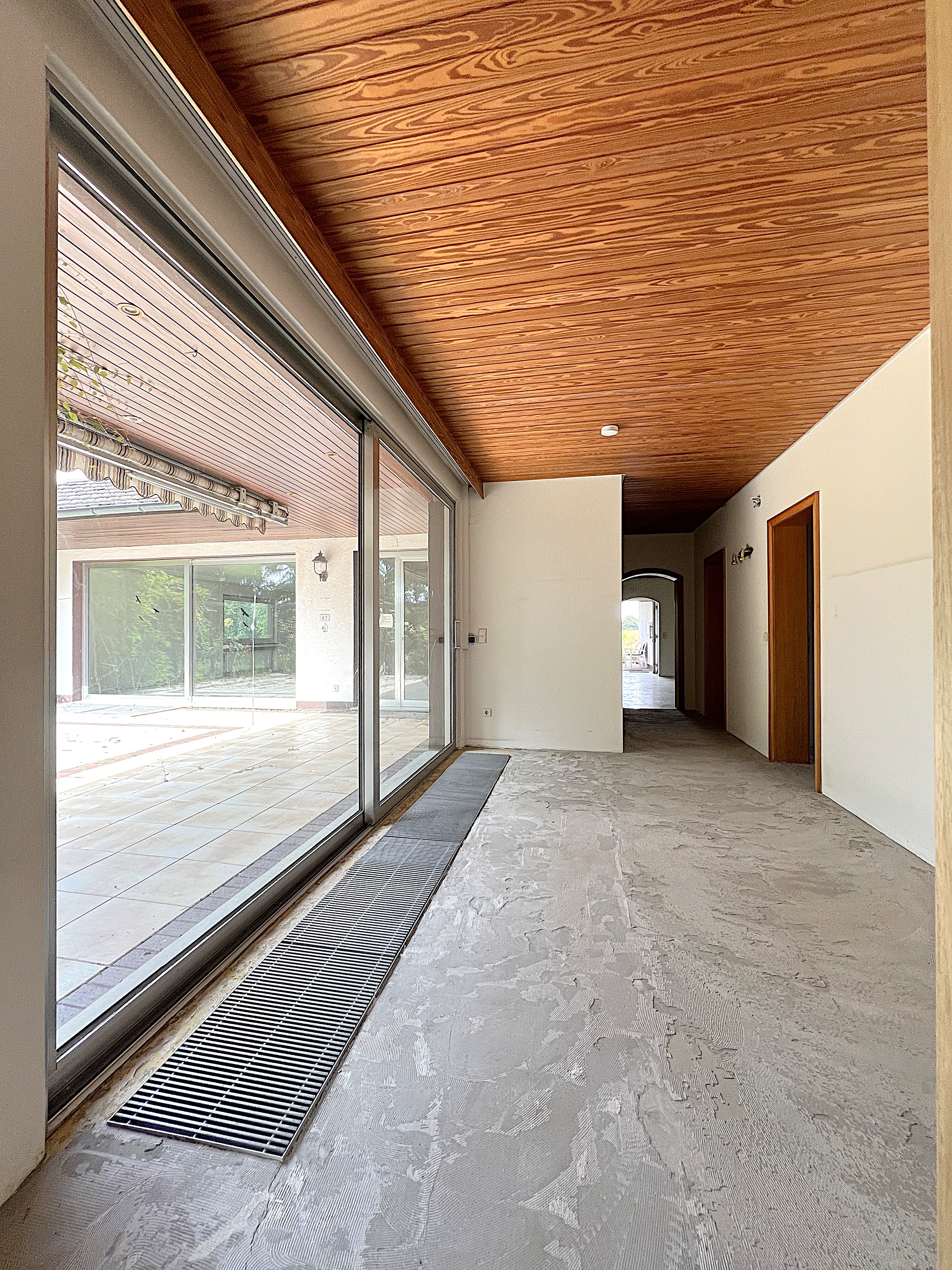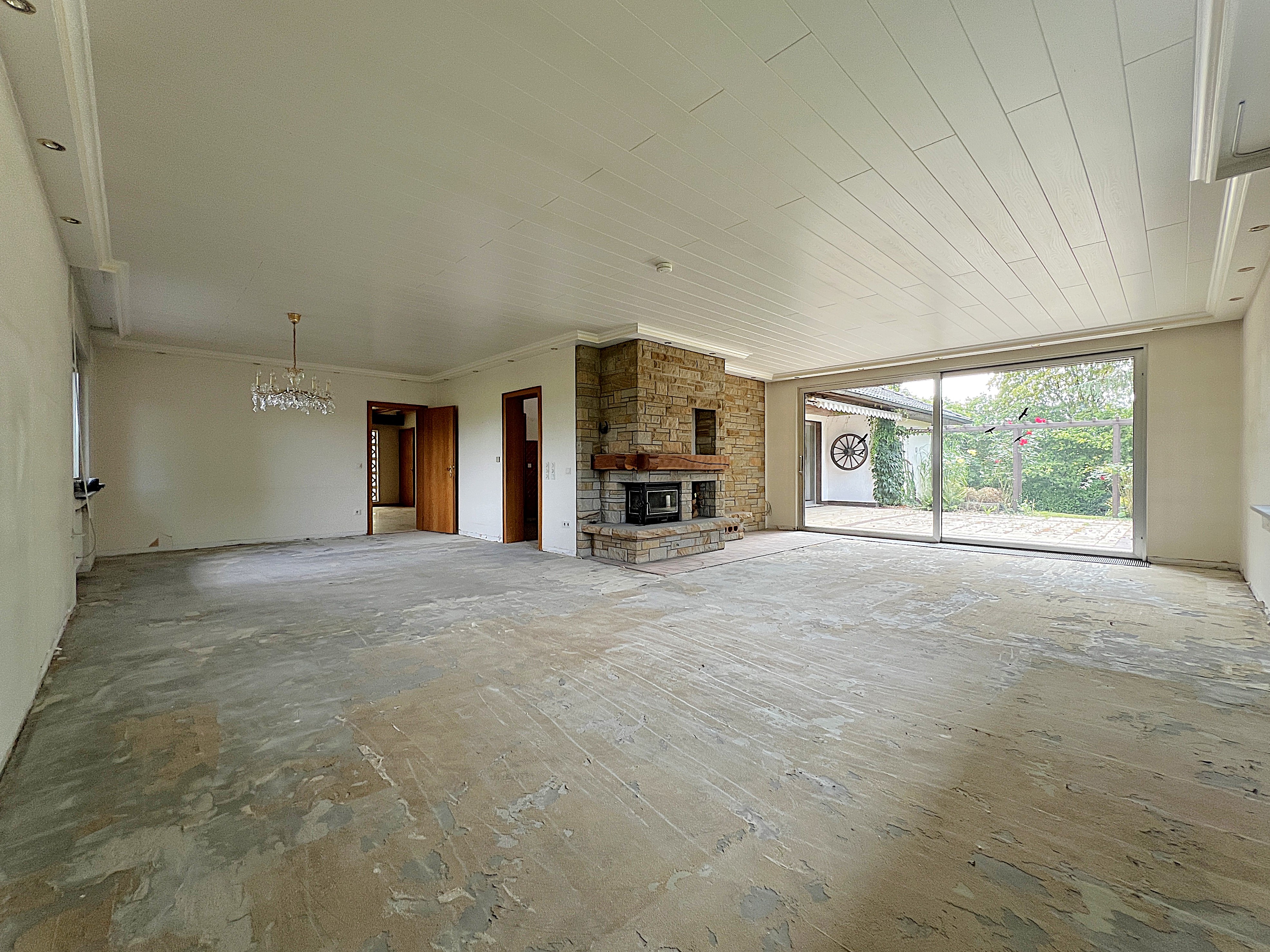 Empfangen werden Sie von der imposanten Hofzufahrt, die gleichermaßen viel Außenstellplatz für Ihren Familienfuhrpark bietet. Vollkommen stufenlos überwinden Sie zunächst den praktischen Windfang mit nahtlosem Übergang zu Ihrem rund 26 m² großen eindrucksvollen Empfangsbereich nebst Gäste-WC und Garderobenmöglichkeit. Von hier erreichen Sie den prestigeträchtigen, L-förmig geschnittenen Wohn- und Essbereich mit rund 61 m² Wohnfläche zuzüglich angrenzender Küche mit Vorratsraum und eigenem Terrassenzugang. Ihr stattlicher Wohnbereich ist zusätzlich mit einem modernisierten Kaminofen für kalte Wintertage ausgestattet. Breitformate Aluminiumschiebeelemente ebnen von hier den stufenlosen Ausgang auf Ihre Terrasse mit idealtypischer Südwestausrichtung. Besonderes Highlight ist der weitläufige, ruhige Garten mit gewachsenem Baumbestand, der einerseits viel Platz zum Herumtollen und Spielen und andererseits viel Privatsphäre in dünnbesiedelter Lage bietet.