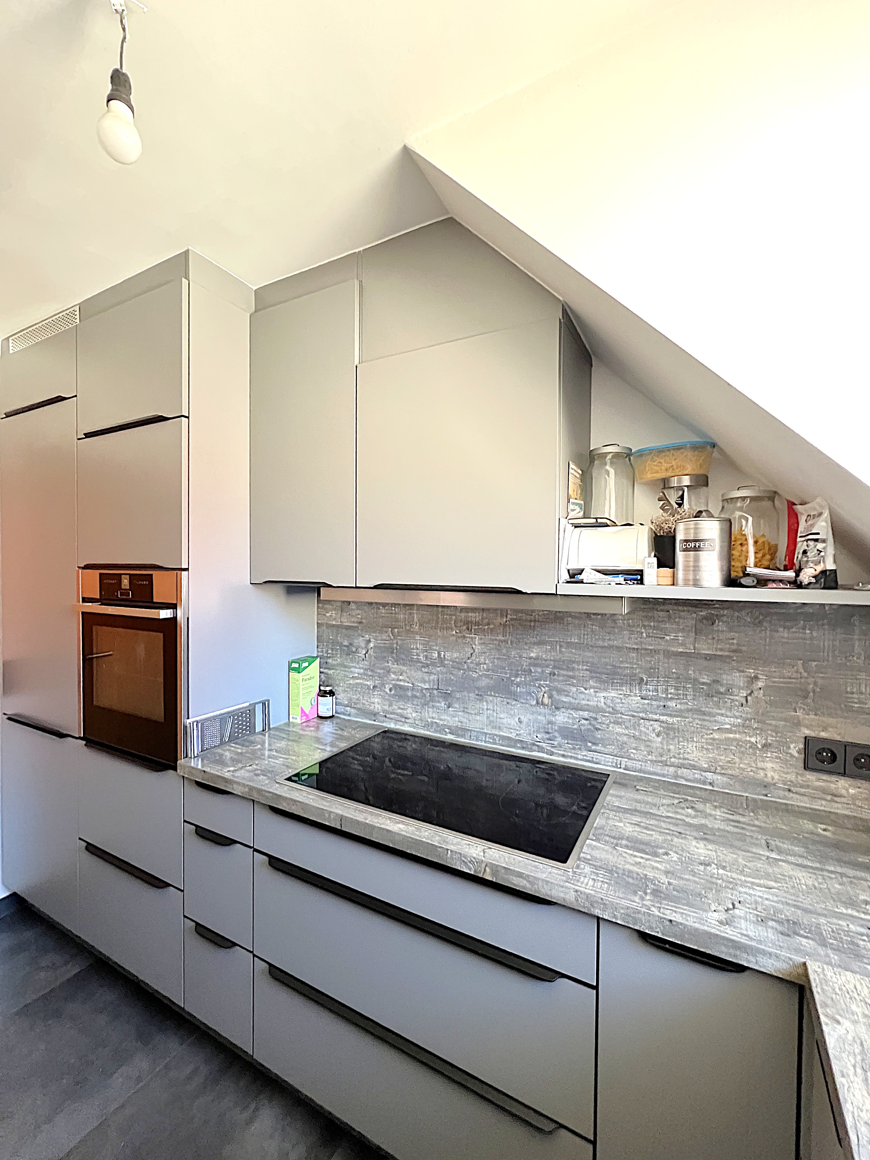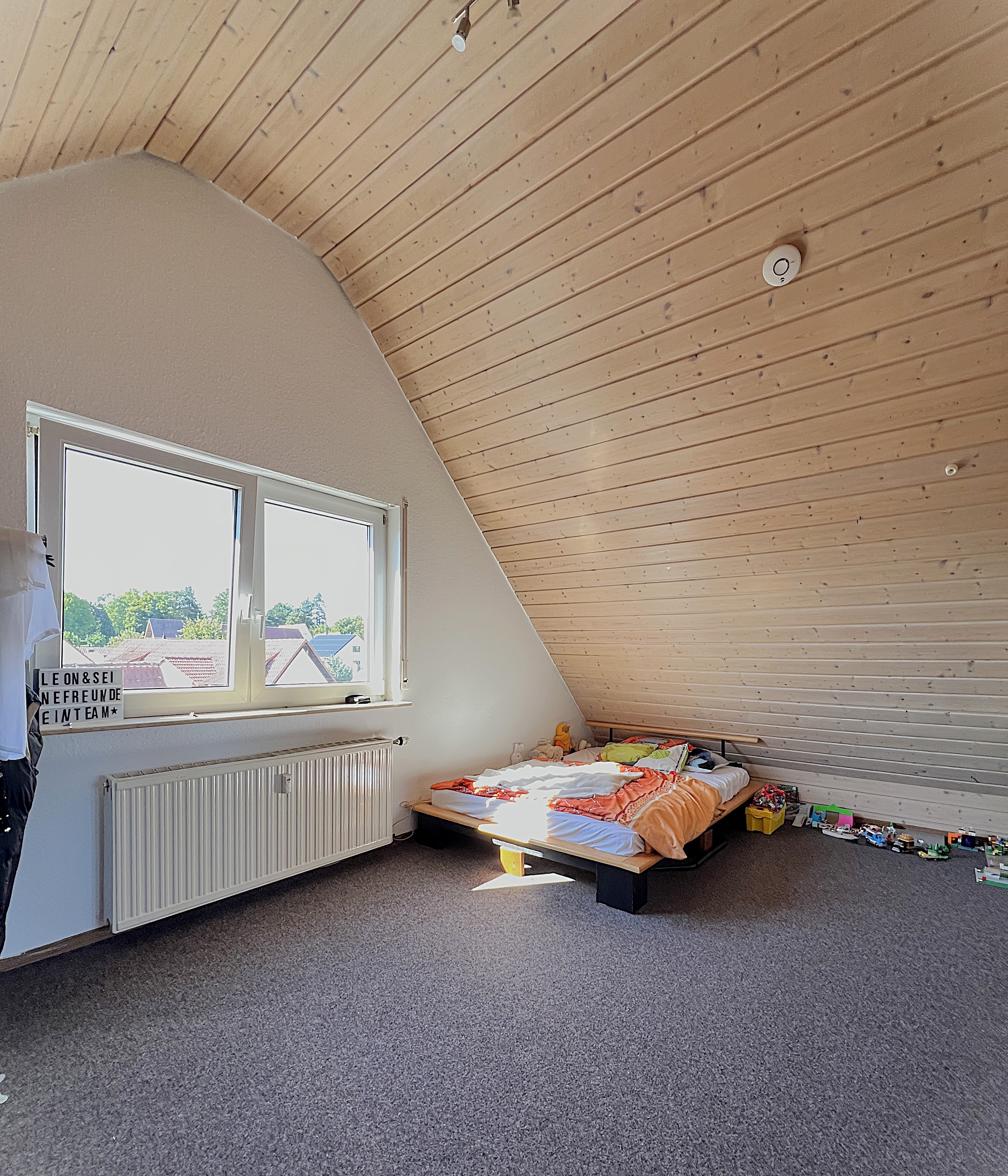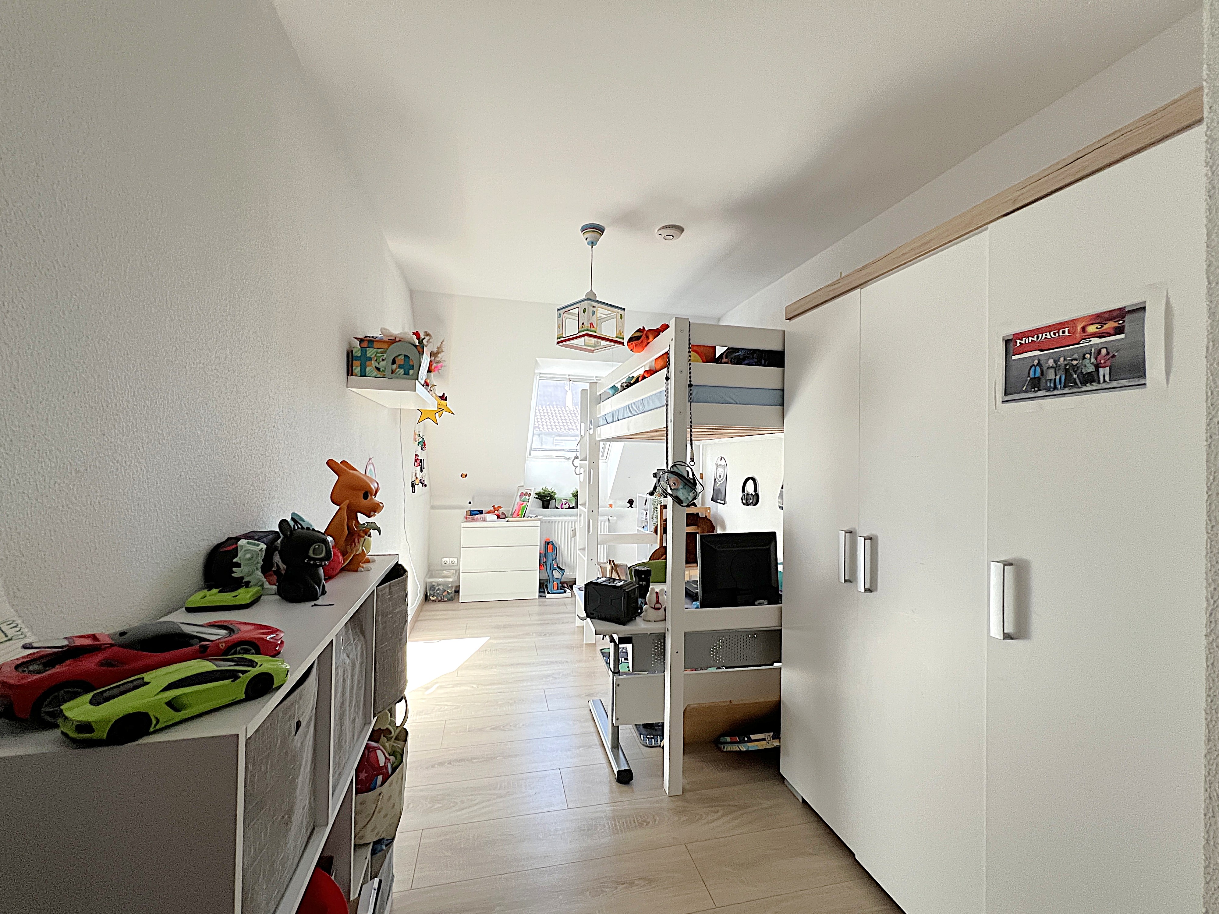 Die insgesamt rund 104 m² qualitativ ausgestattete Wohnfläche erstreckt sich mit 4,5 Zimmern (davon 3 vollwertige Schlaf-/Kinderzimmer), Badezimmer, Toilette, 2 Abstellräume, Küche und Dielen sowie Balkon in idealtypischer Südwestlage über 2 Wohnebenen im 1ten Ober- und Dachgeschoss des vollunterkellerten Wohnhauses. Hierdurch lassen sich praktischerweise die Wohn- und Schlafbereiche räumlich voneinander entkoppeln, sofern Sie innerfamiliär z. B. zu unterschiedlichen Zeiten schlafen und arbeiten oder Ihr ältestes Kind seinen eigenen Rückzugsort schaffen möchte. Die Hauptwohnebene empfängt Sie mit rund 76 m² Wohnfläche. Der strukturgebende Flur bietet Ihnen – neben ausreichend Platz für Ihre Garderobe – Zugang zu Ihren 2 Schlaf-/Kinderzimmern, einem praktischen Abstellraum, Ihrer neuen Küche und modern sanierten Badezimmer mit Badewanne und Dusche sowie Waschmaschinenanschluss, so dass Ihnen lästige Kellergänge erspart bleiben. Highlight Ihrer neuen Wohnung ist der – bedingt durch die bodentiefen Fensterelemente – tageslichtdurchflutete Wohn- und Essbereich als zentralen Ankerpunkt Ihrer neuen Wohnung, der Ihnen nahtlosen Zugang zu Ihrem Sonnenbalkon mit Markise ermöglicht.