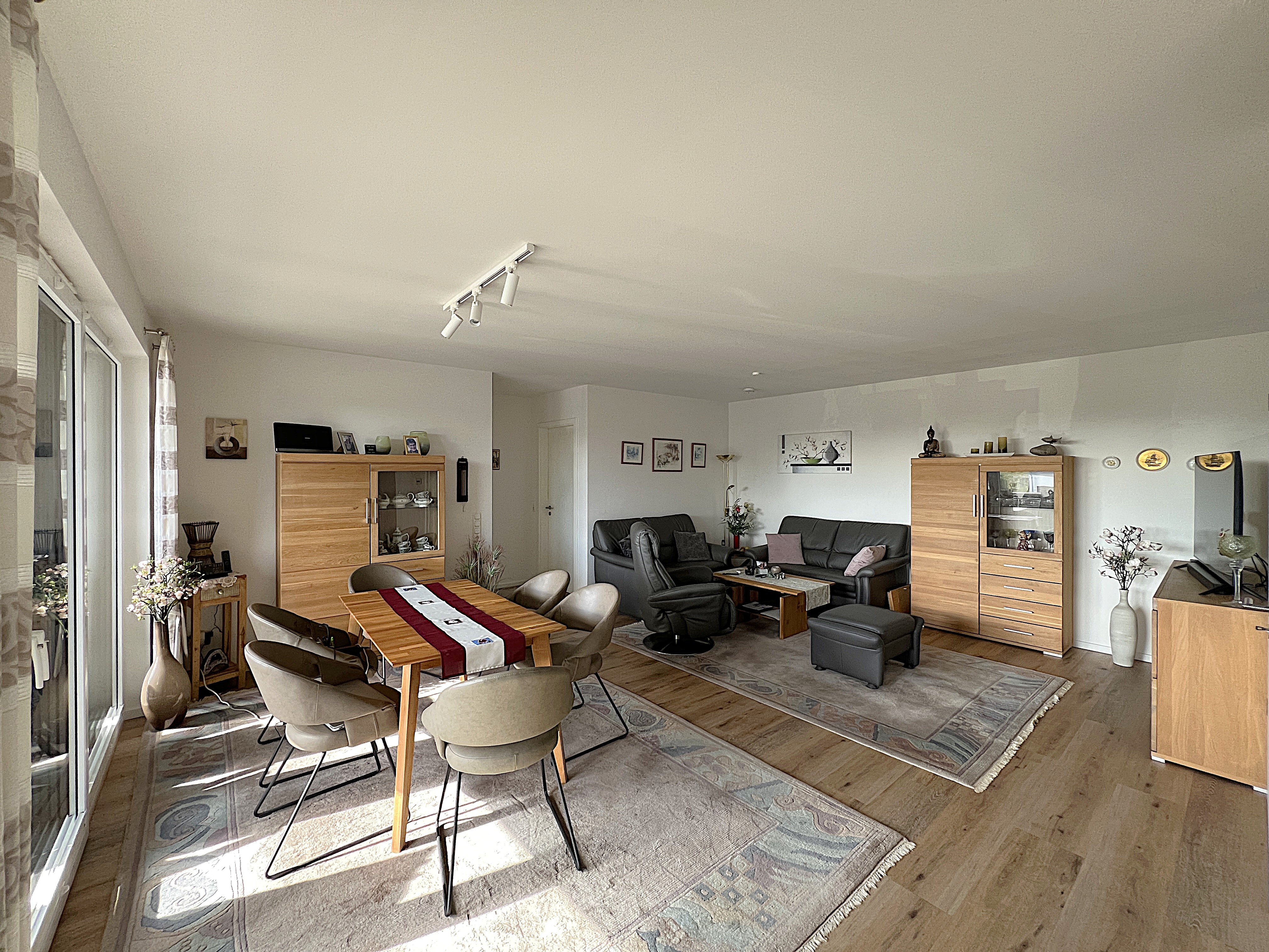 Stufenlos und bequem ebnet Ihnen der geräumige Fahrstuhl den Weg zu Ihrer Wohnung ins 1. Obergeschoss, die mit 2 Schlaf-/Kinderzimmern ohne störende Schrägen (davon 1 Zimmer mit Balkonzugang), Badezimmer, großräumigem Wohnzimmer mit integriertem Essbereich, direktem Balkonzugang und fließenden Übergang zur angrenzenden, offen gestalteter Küche besticht. Die neuwertige Einbauküche inklusive E-Geräte und viel Stauraumkapazität, die optional zu erwerben ist, bietet einen praktischen Waschmaschinenanschluss, so dass lästige Kellergänge entfallen. Das moderne Badezimmer besticht zudem mit einer bodengleichen Walk-In Dusche. Der attraktive, überdachte Balkon mit Süd-/Südwestausrichtung lädt Sie und Ihre Gäste zum abendlichen Verweilen bei lauer Sommerluft ein.